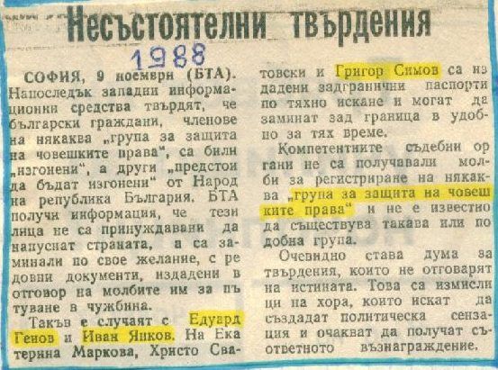 Да видим как стоят нещата в действителност. Ами погледнете изрезката от в-к “Работническо дело” и ще разберете. Григор Симов заедно с други неудобни за властите лица, предимно активисти на НДЗПЧ бяха изгонени от България. И когато чуждите радиостанции вдигнаха шум, БТА излезе с официално изявление, че видите ли, хората сами били поискали да напуснат страната. И другарят Тодор Живков като много хуманен държавник, решил да ги пусне.