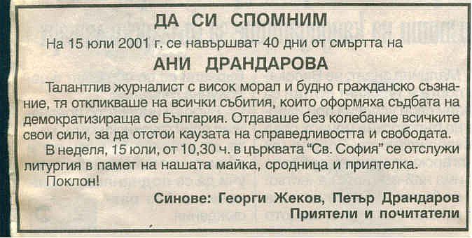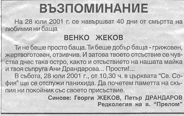 Сега още нещо за антикомунизма на Жеков. Той твърди, че родителите му били убити от комунистите, затова ги мразел. Твърди го не на чашка и на маса, а от телевизионния екран. Значи го твърди сериозно. И като говори, хората остават с впечатление, че те са били убити от ДС по времето на живковия режим. Ама дали е така? Както всеки може да види от некролозите, публикувани във в-к „Прелом”, и двамата родители на Георги Венков Жеков умират през 2001 година. Интересно е да се каже, че „Прелом” беше издание на БДФ, организация, която Жеков особено яростно ругае. Прикачена снимка (десен клавиш и view image, за да я видите) |